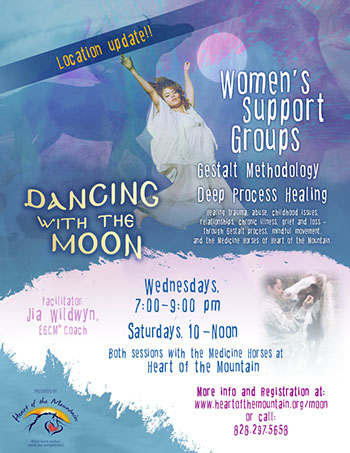 Welcome, and thank you for your interest in Heart of the Mountain’s Dancing With The Moon, a women’s support group. I am an Equine Gestalt Coach, and have been co-facilitator of Conscious Dance Boone for five years. Movement and dance are incorporated into the sessions as well.